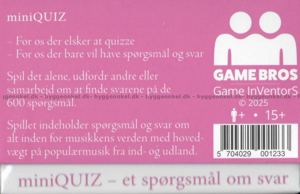 Spillet er designet i et praktisk og kompakt format, der gør det nemt at tage med på farten, hvad enten du er til fest, på ferie eller blot ønsker lidt sjov i hverdagen. MiniQuiz: Musik kan spilles på mange forskellige måder, hvilket gør det nemt at tilpasse til både korte runder og længere quizdueller. Det er spillet, der bringer musikken ind i hyggen, skaber grin og får alle til at nynne med på minderne fra deres yndlingssange.