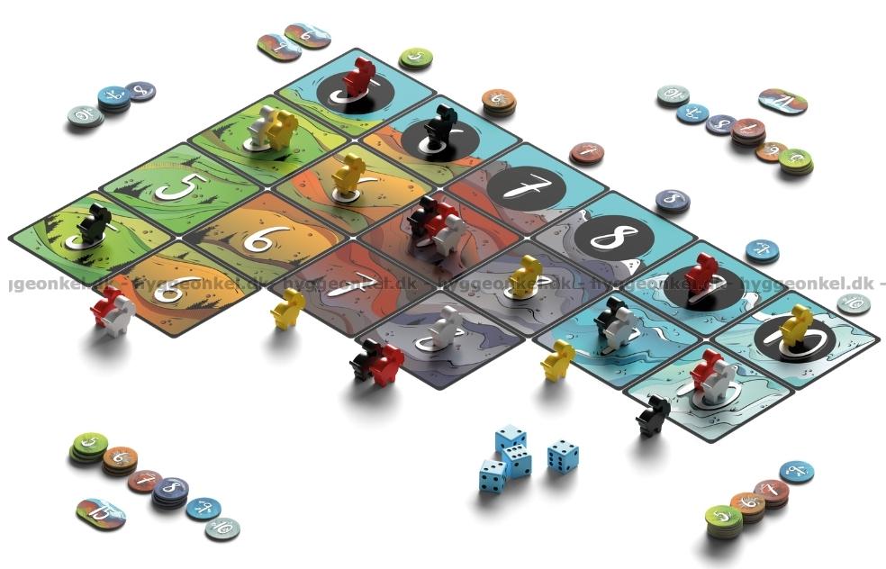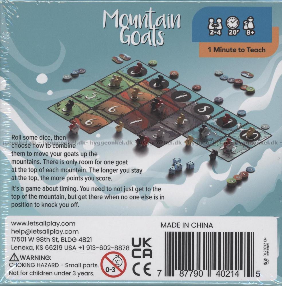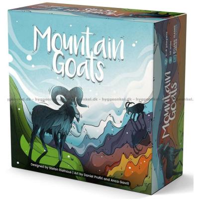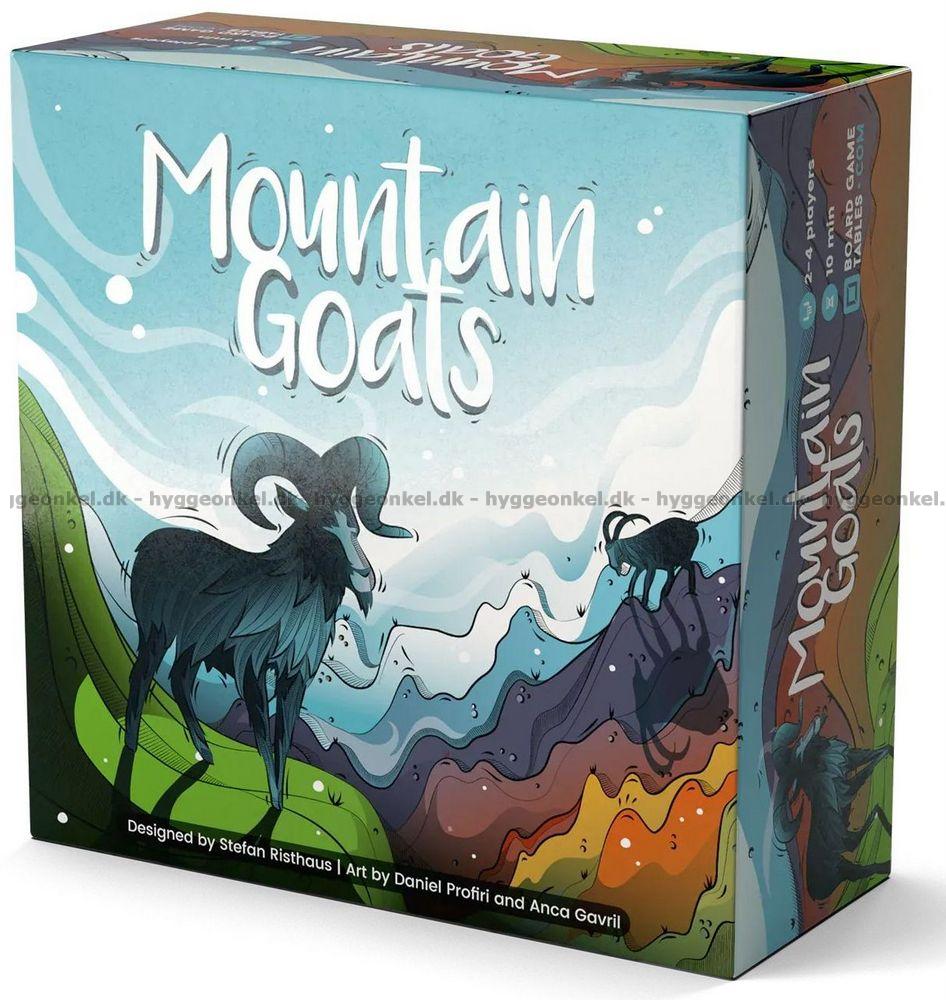 Mountain Goats er et hurtigt og taktisk familiespil, hvor det gælder om at få dine geder helt til tops på bjergene – og skubbe de andre ned undervejs. Hver spiller har en ged ved foden af hvert bjerg, og med fire terninger forsøger du at lave kombinationer, der matcher bjergenes tal og sender dine geder opad.