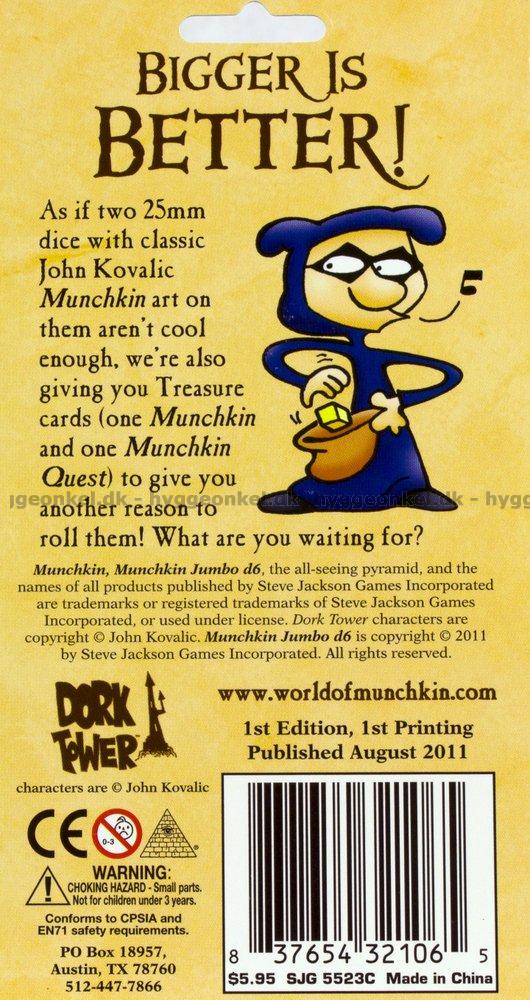 Den ene terning er en Munchkin d6 - den anden terning er en Monster d6. Begge med illustrationer af John Kovalic