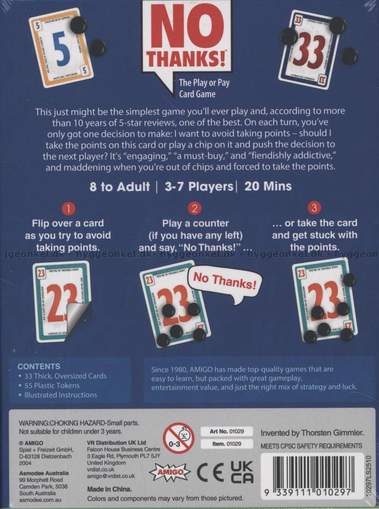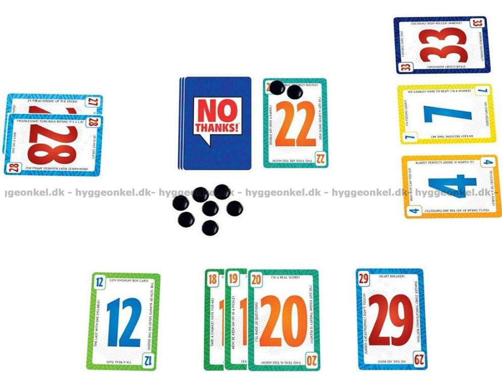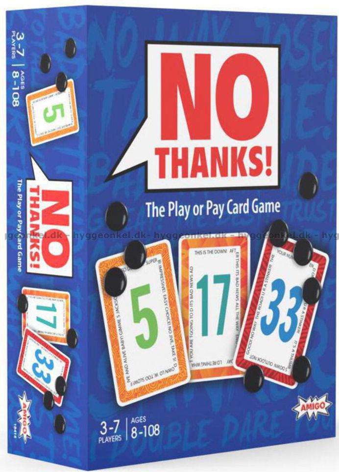 No Thanks er et enkelt, men overraskende nervepirrende kortspil, hvor hver beslutning føles som et lille spil i sig selv. Foran dig ligger et kort, som du enten kan tage imod eller forsøge at sende videre, og netop i dette valg opstår spillets spænding. For selvom et kort kan se uskyldigt ud ved første øjekast, kan det hurtigt vise sig at være en byrde, du helst ville have undgået.
