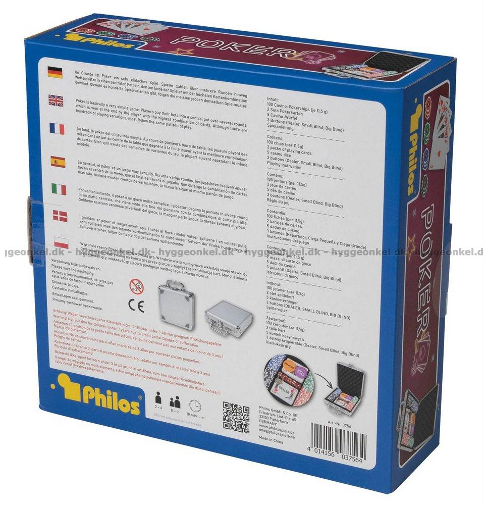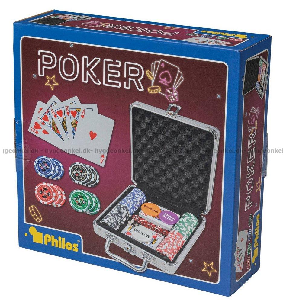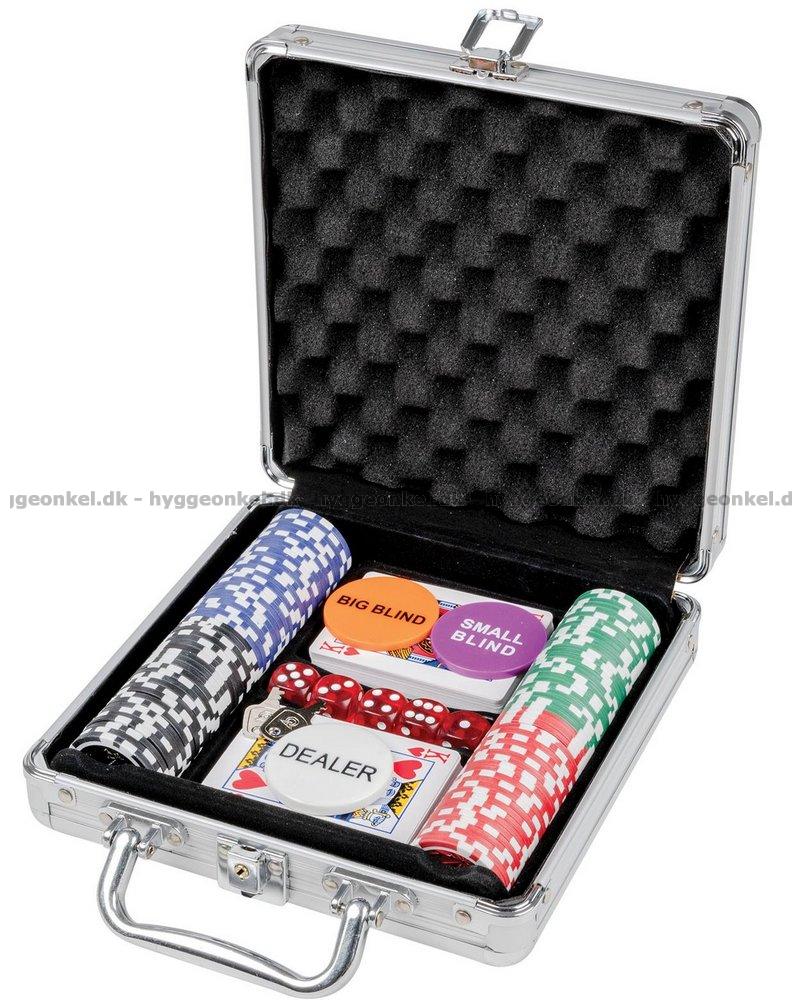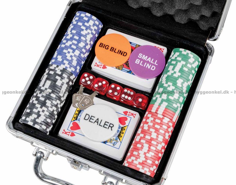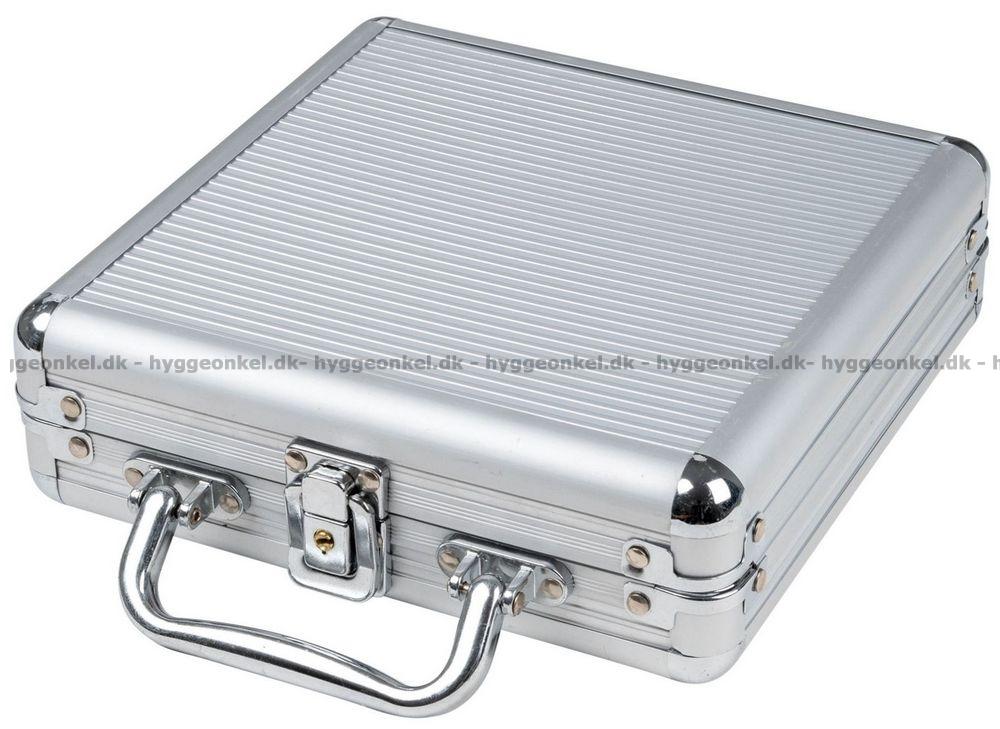 Her får du en kuffert med jetoner og kort - alt hvad der er brug for til en hyggelig pokeraften.