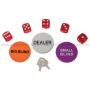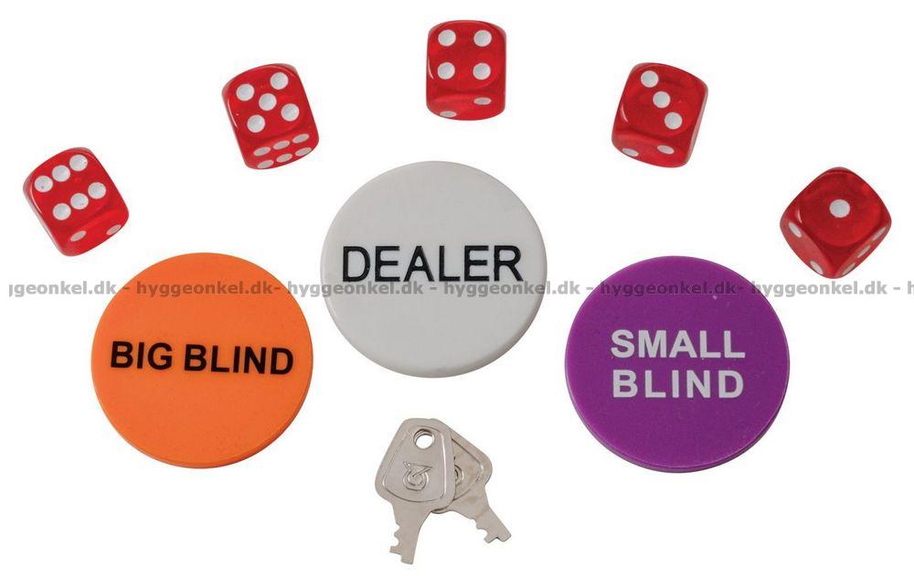 Derudover 2 sæt spillekort, 5 casinoterninger og 3 buttons (DEALER, SMALL BLIND, BIG BLIND).