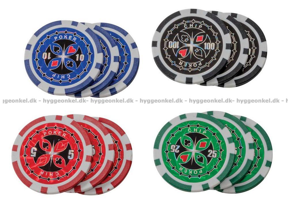 - 100 stk. pokerjetoner fordelt på 4 farver