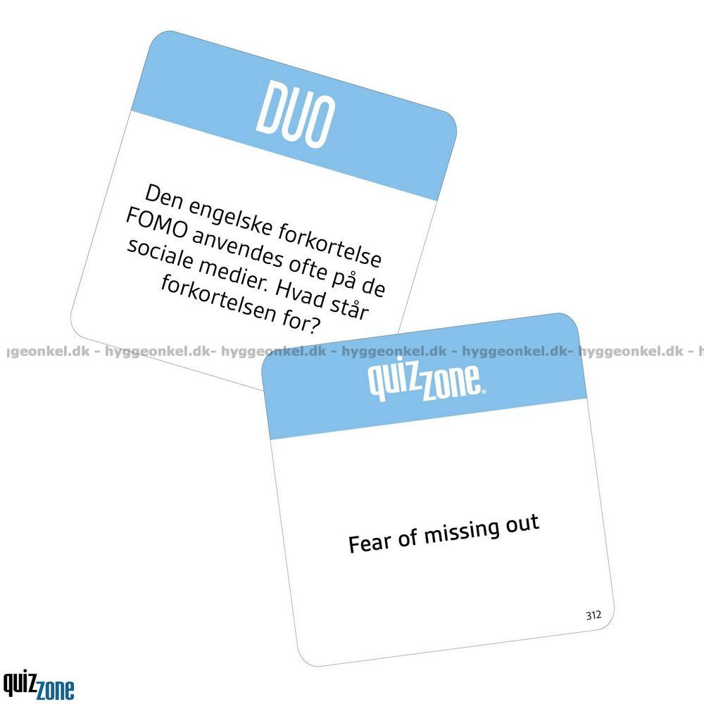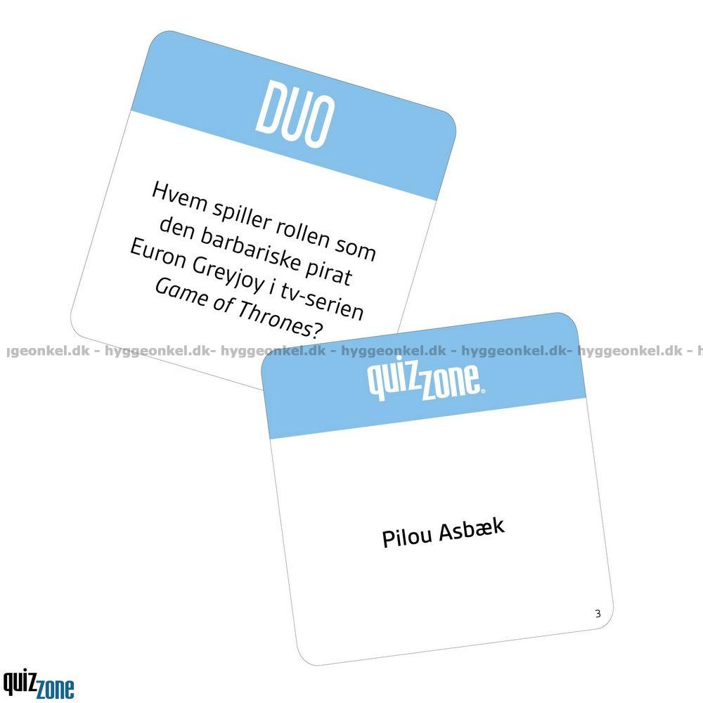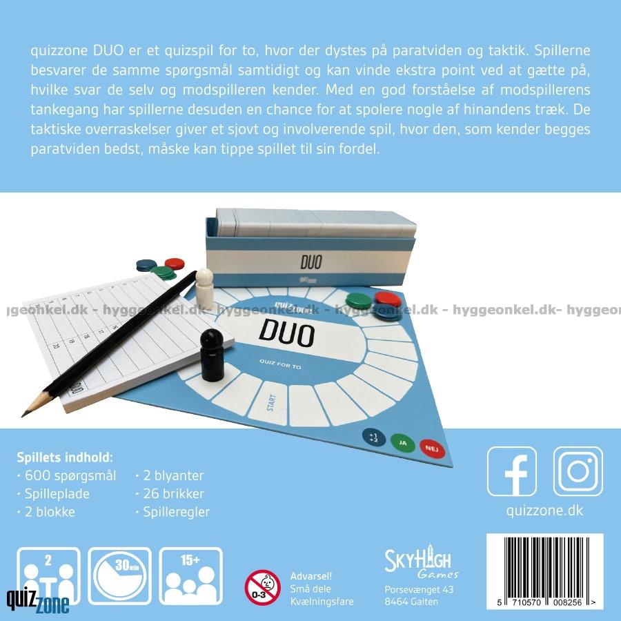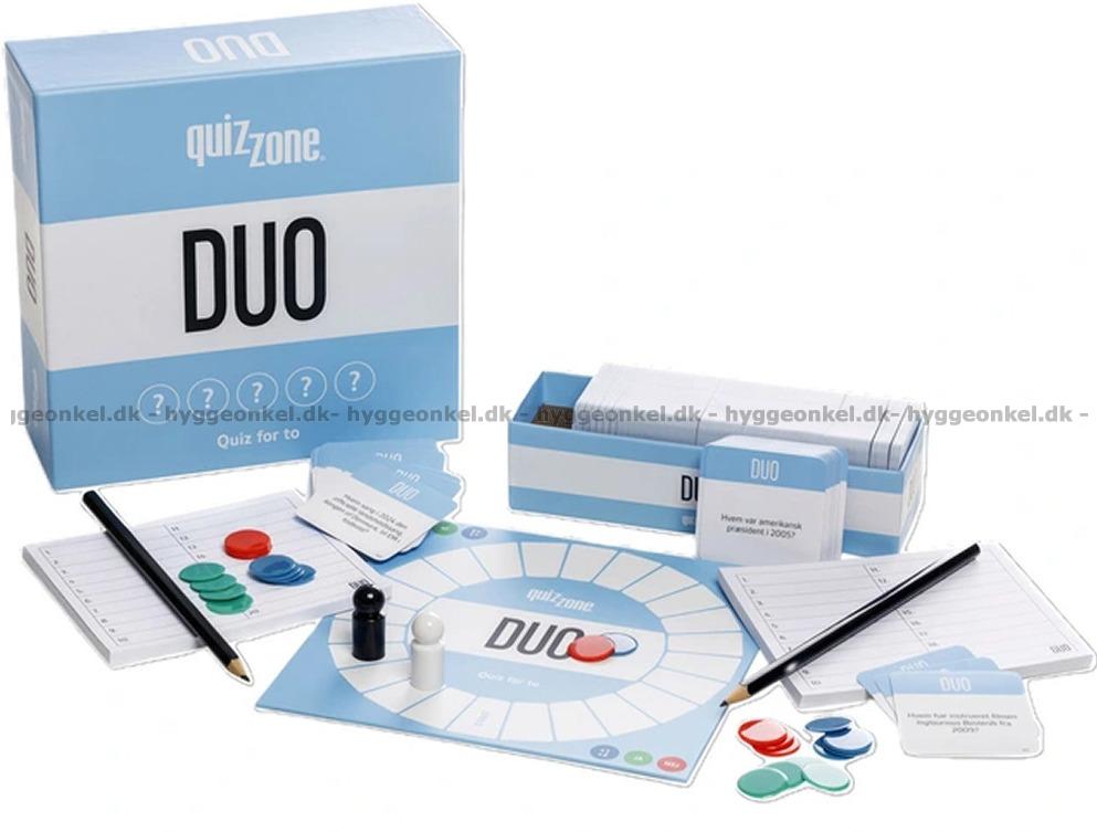 Quizzone: Duo er et quizspil fyldt med spænding, taktik og masser af sjov. Spillet er skabt til to personer og består af 20 spørgsmålrunder, hvor I skiftes til at være Oplæser og Satser. Hver runde udfordrer både jeres viden og jeres evne til at tænke taktisk, for med elementer som annullering og pointbrikker bliver der hele tiden vendt op og ned på dynamikken mellem jer.