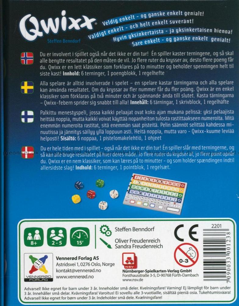 Qwixx er lært på 2 minutter, så man skal ikke bruge tid på at sætte sig ind i kringlede spilleregler, men kan hurtigt komme i gang med at spille.
