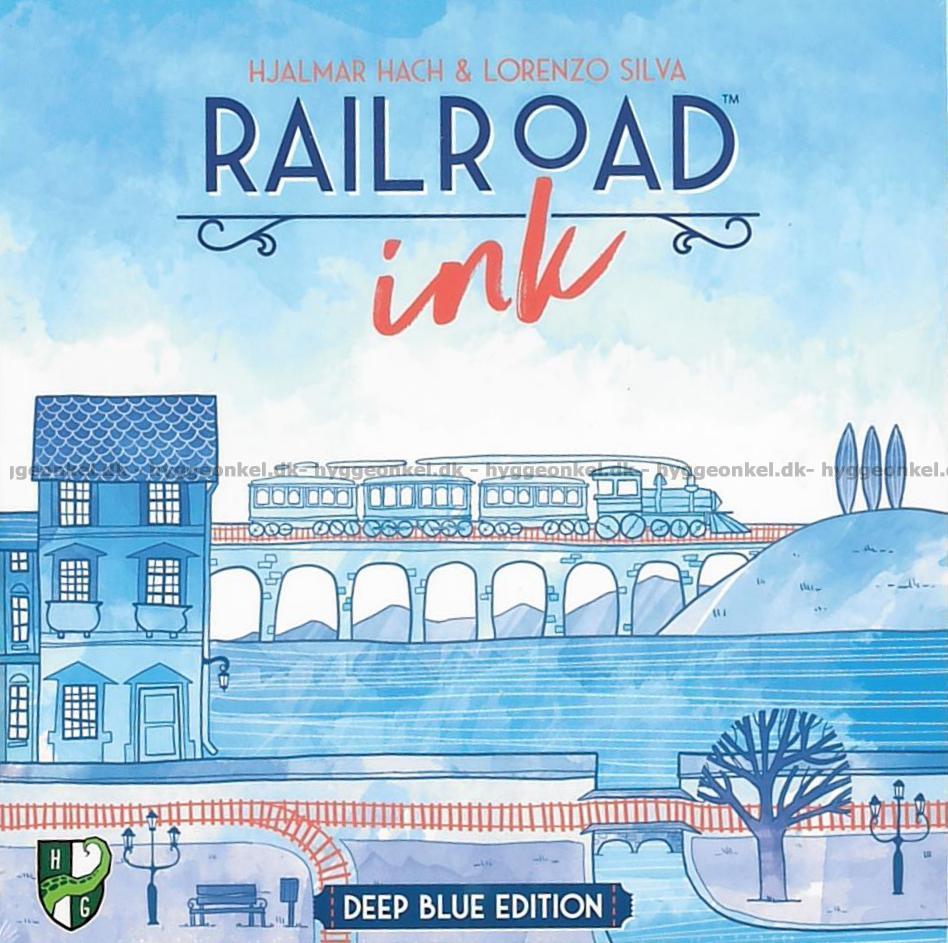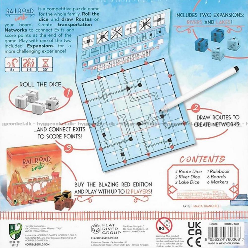 Railroad Ink kommer flere, der hver har to udvidelser med ekstra terninger, der føjer ekstra regler til spillet. Den Blå udgave inkluderer Rivers- og Lakes-udvidelserne. Gør spillet sværere ved at føje floden til spillet, og brug søerne til at forbinde dine netværk med færger. Disse særlige regler sætter fut i spillet og gør hver gennemspilning unik.