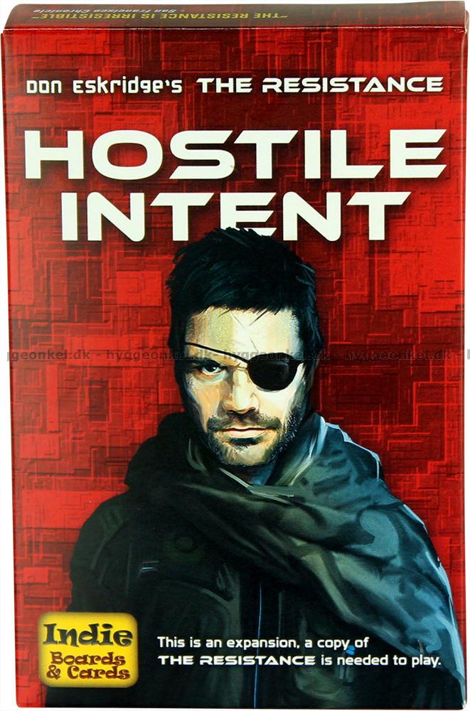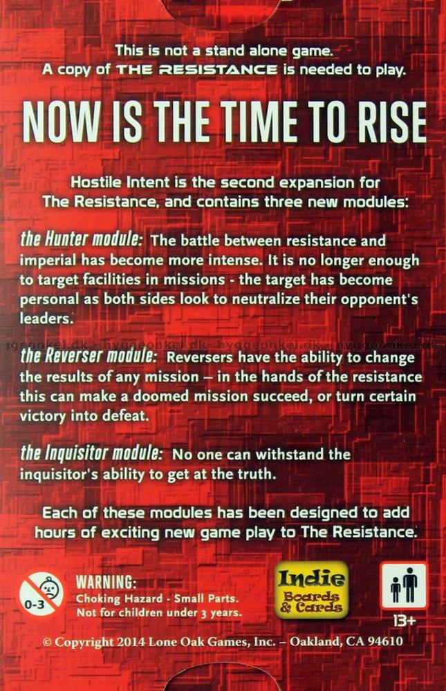Hostile Intent er en udvidelse, der indeholder tre moduler, som man kan tilføje enkeltvis eller samlet til et spil Resistance.