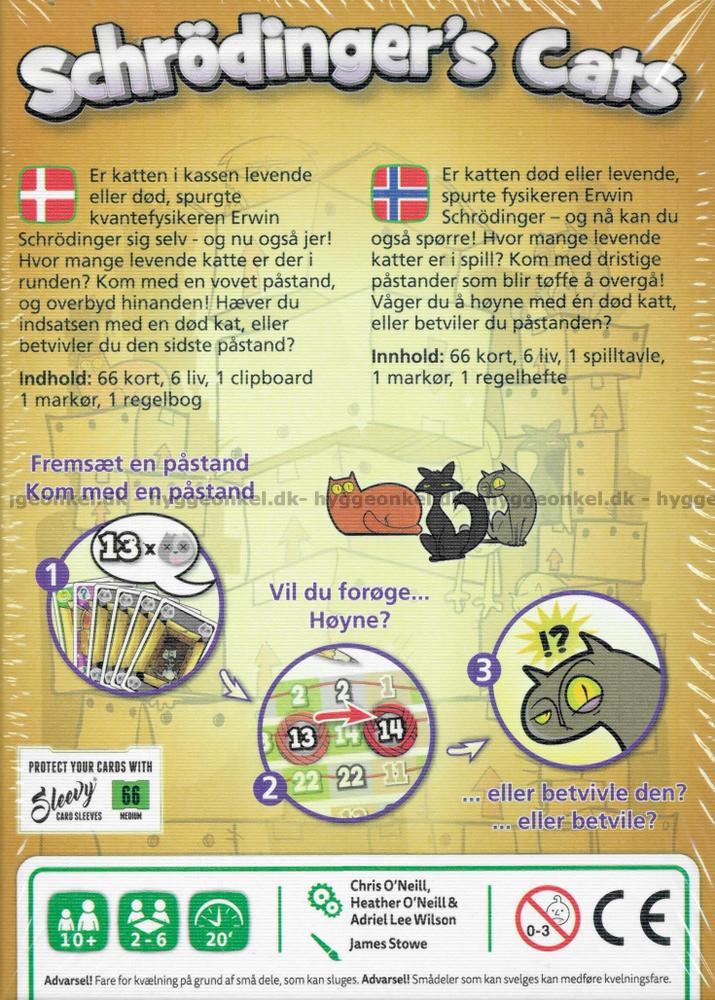 Hver runde bliver kortere og mere intens, indtil der kun står én spiller tilbage som den sidste kat. Schrödinger’s Cats er et hurtigt, taktisk og festligt bluffspil, hvor både strategi og humor går hånd i hånd.