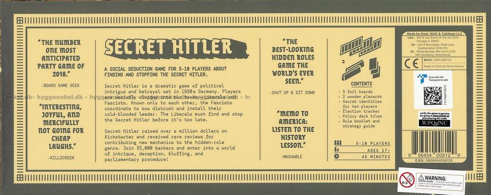 Det er dog svært, for der er hemmelige fascister iblandt jer, som vil modarbejde jer, og en spiller har rollen som ’Secret Hitler’.