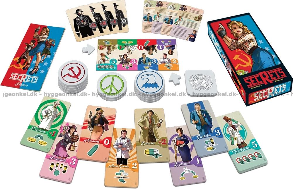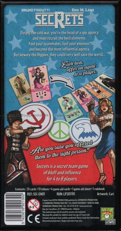 I Secrets, det andet samarbejde mellem designerne Eric Lang og Bruno Faidutti, bliver spillerne fordelt på to hemmelig hold — CIA eller KGB — og skal prøve at få flest point til deres eget hold. Desuden er en eller to af spillerne Hippier, der hader Systemet og arbejder for sig selv. Deres mål er at kæmpe for den jævne mand og have færrest point.