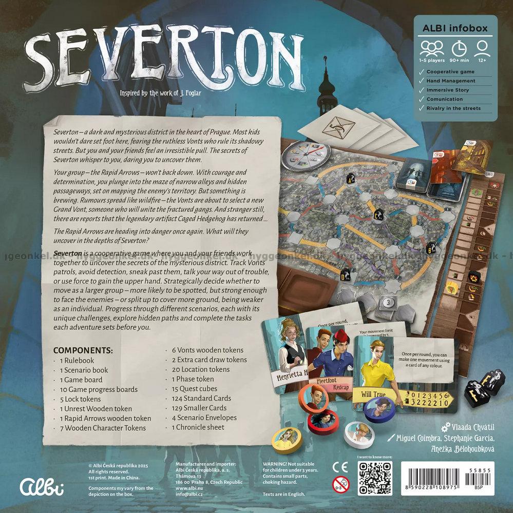 Severton er et taktisk samarbejdsspil, hvor du træder ind i den gådefulde verden kendt fra Jaroslav Foglars kultklassiker. Som medlemmer af Rapid Arrows bevæger I jer gennem Severtons snørklede gader, skjulte kældergange og forladte baggårde, altid jaget af de farlige og dominerende Vonts, som patruljerer byen. Hver runde er bygget op omkring en spændingsfyldt rytme af handlinger, udforskning og konsekvenser, hvor selv de mindste beslutninger kan få stor betydning.
