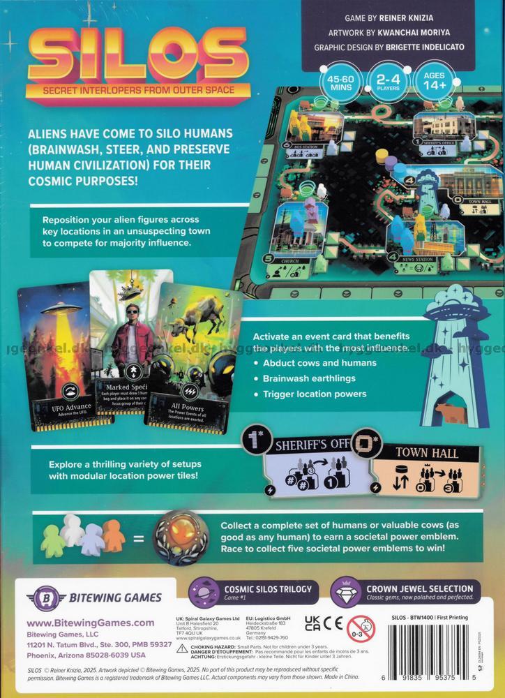 Det er året GLork-too-vlEEp – eller 1983 ifølge jordisk tid. I Silos er menneskeheden blevet centrum for en hemmelig invasion, hvor udenjordiske væsner konkurrerer om at overtage kontrol med en lille by og dens befolkning. Som leder af en rumvæsenfraktion skal du infiltrere samfundet, bortføre både mennesker og køer og udnytte dine kræfter til at manipulere byens institutioner. Gennem strategi, timing og bluff kæmper spillerne om at få størst indflydelse i byens vigtigste områder – fra rådhuset og universitetet til kirken og nyhedsstationen. Ved at samle de rette kombinationer af mennesker – politikere, embedsmænd, influencere og fagfolk – kan du opnå magtsymboler, der bringer dig tættere på total kontrol.