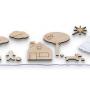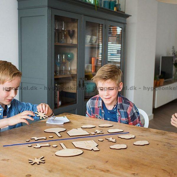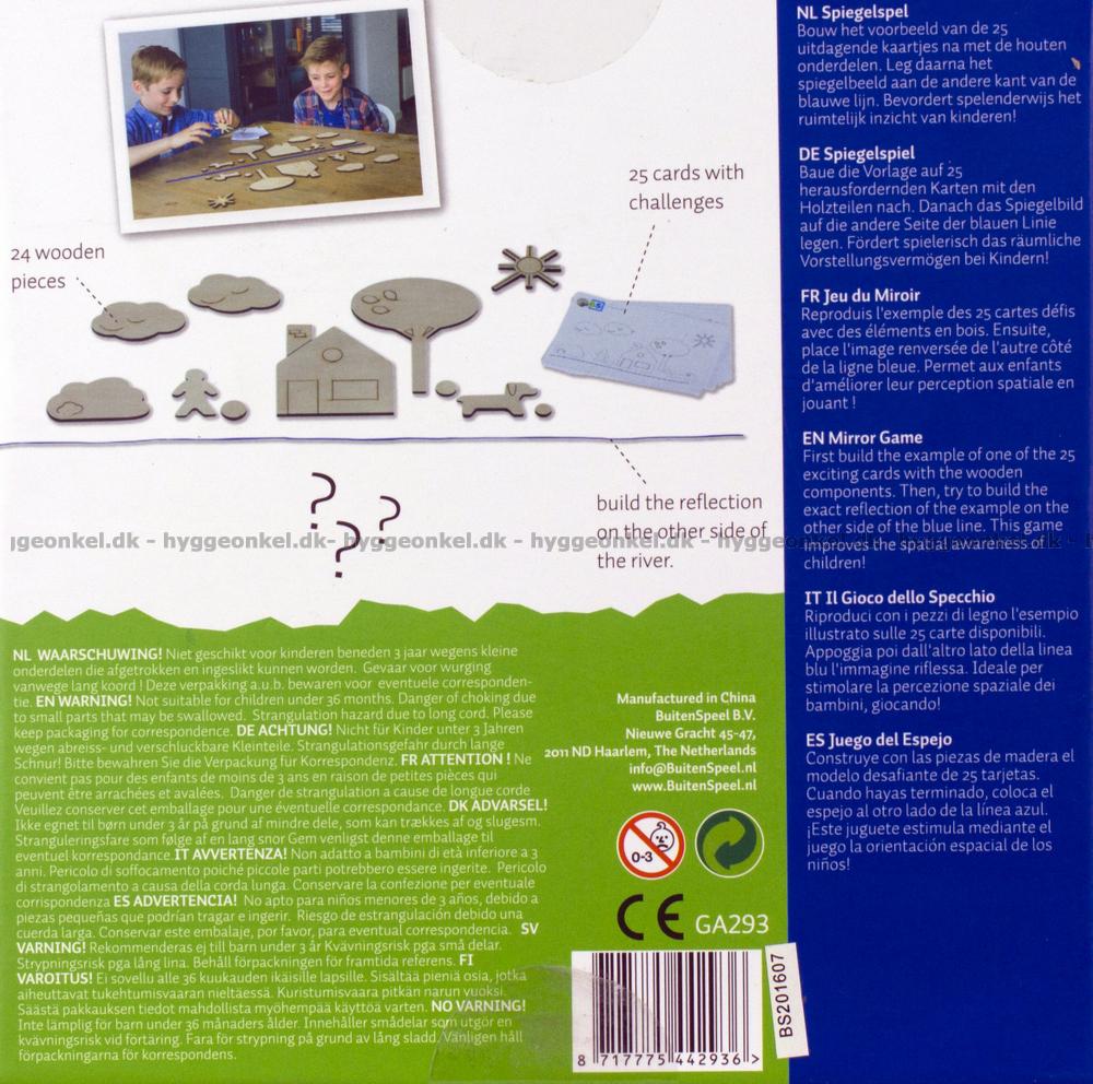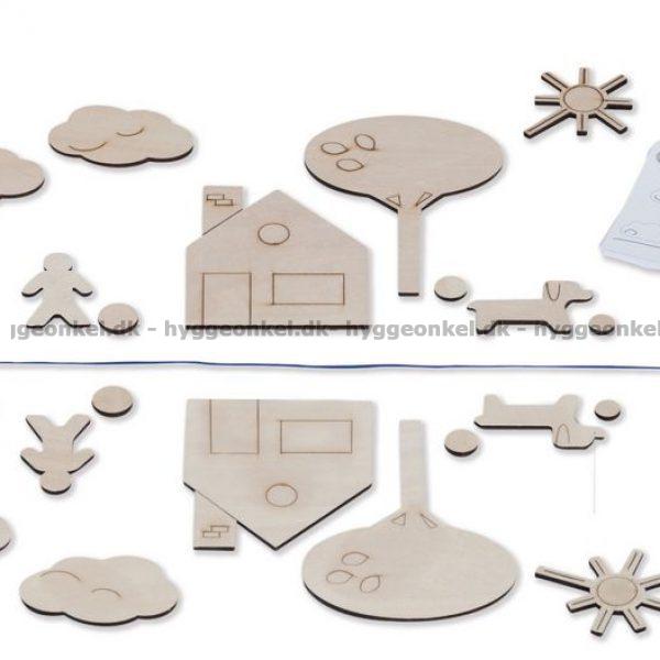 24 træbrikker og 25 opgaver med løsninger på bagsiden.