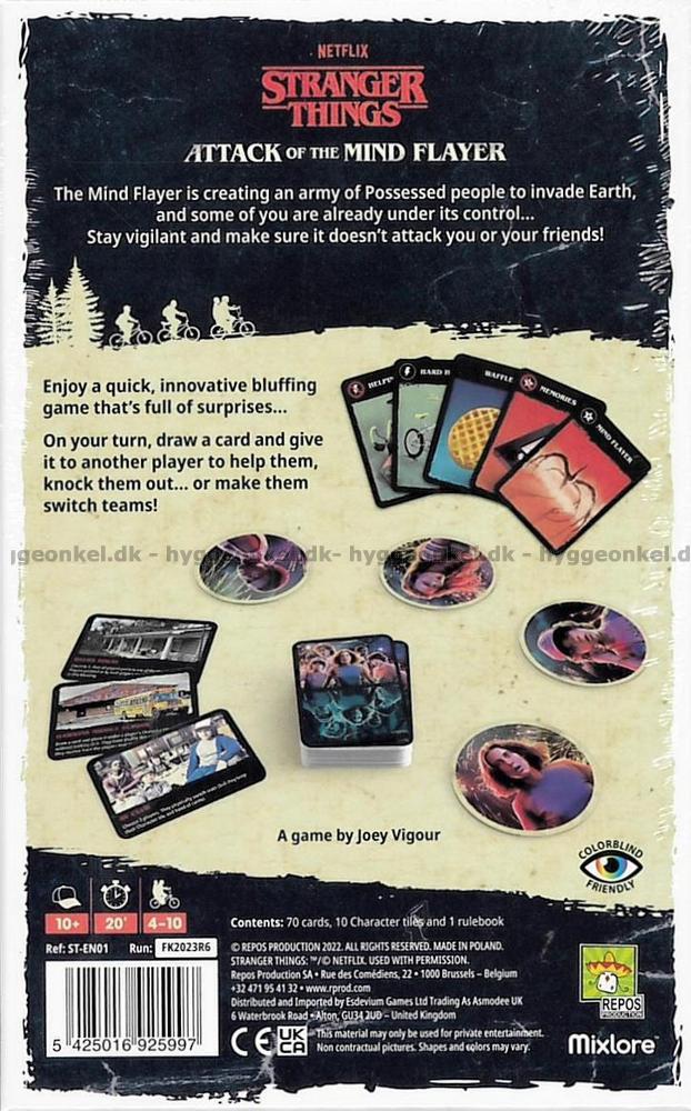 “Stranger Things: Attack of the Mind Flayer” kaster dig direkte ind i Hawkins’ mørke mysterier, hvor intet – og ingen – er helt, som de ser ud. Spillerne fordeles i hemmelighed på to hold, de Sane og de Possessed, og mens de Sane desperat forsøger at modstå Mind Flayers påvirkning, arbejder de Possessed i skjul for at besætte eller slå deres modstandere ud.