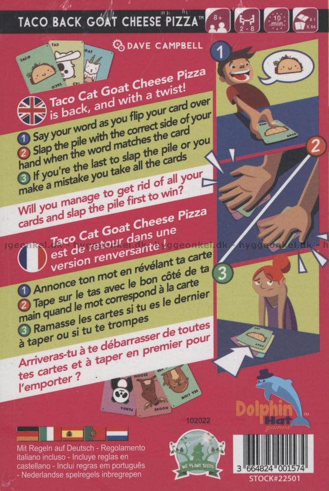 Den spiller, som starter, vender et kort fra sin bunke og siger TACO. Den næste spiller vender et kort og siger CAT osv. Vender du et BACK kort, så skal der tænkes hurtigt!