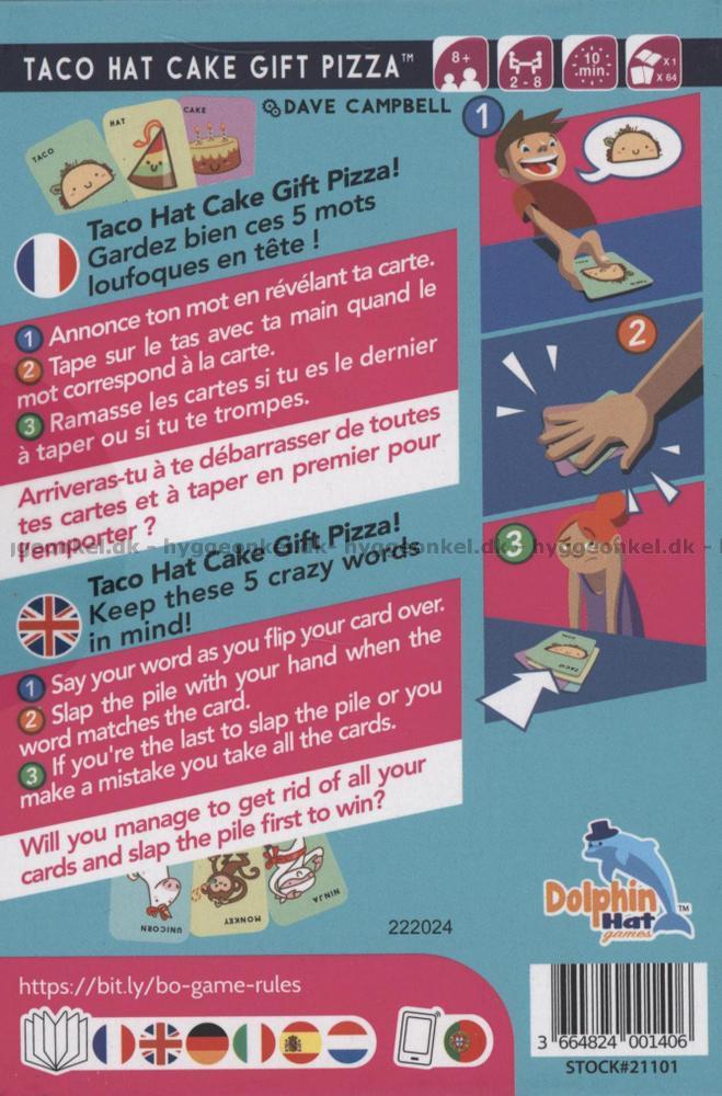 Dette hurtige, herlige kortspil - "TACO HAT CAKE GIFT PIZZA" - er perfekt underholdning til hele familien.