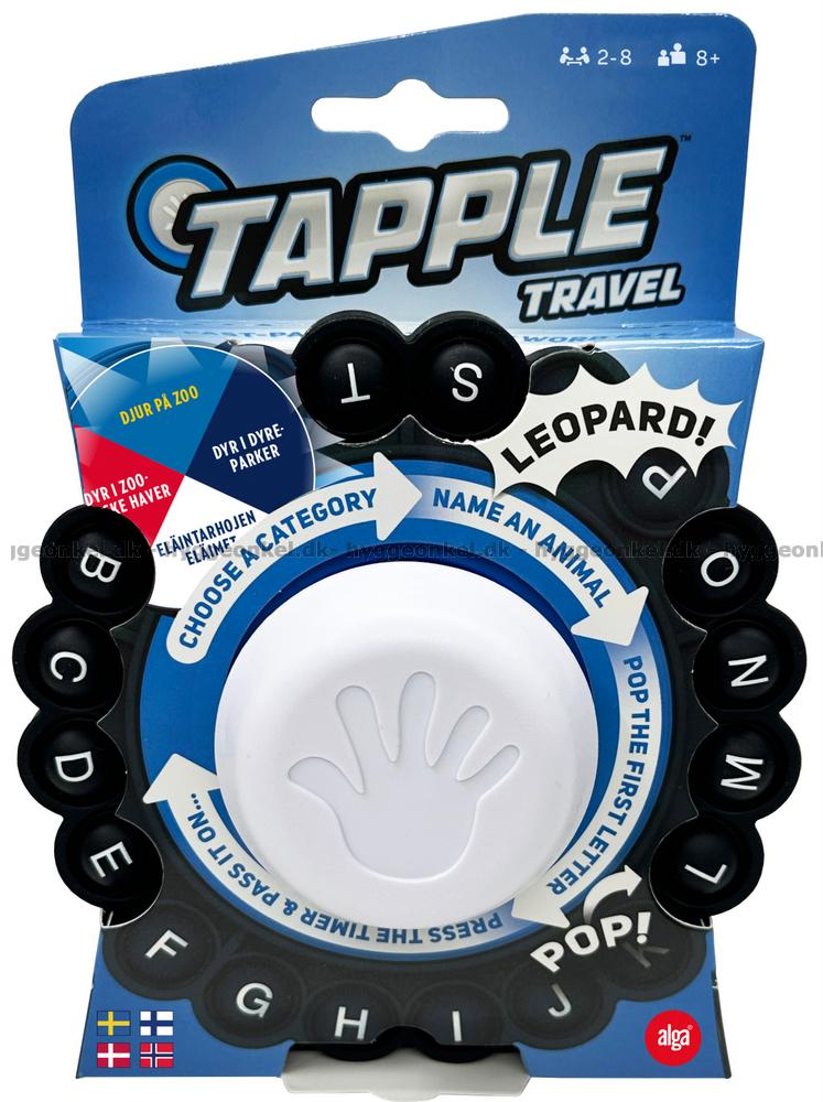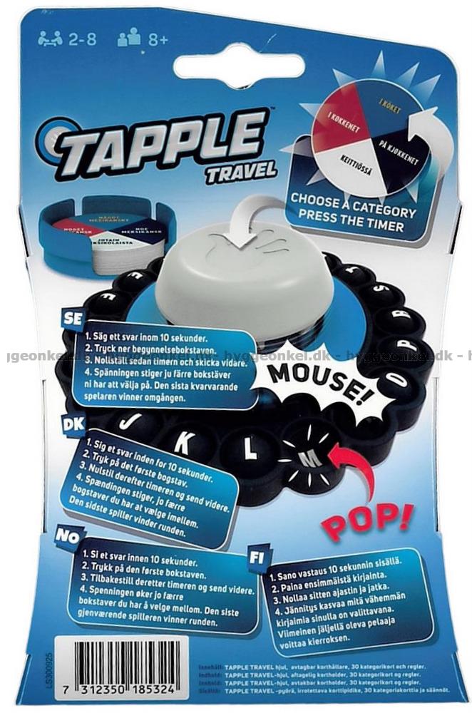 Tapple: Rejsespil er en rejsevenlig udgave af det sjove og underholdende ordspil. Spillet er nemt at tage med på farten og perfekt til ferier, cafébesøg eller hyggelige stunder derhjemme. En kategori trækkes, timeren trykkes ned, og spillerne skiftes til hurtigt at sige et ord, der passer til kategorien, mens de trykker bogstavet i ordets begyndelse ned på hjulet. Presset stiger for hvert bogstav, der forsvinder, og tiden arbejder hele tiden imod jer. Det gælder om at tænke hurtigt, være kreativ og undgå at gentage bogstaver, der allerede er brugt. Spillet fortsætter, indtil én spiller står tilbage som rundens vinder, og målet er at samle kategorikort nok til at vinde spillet.