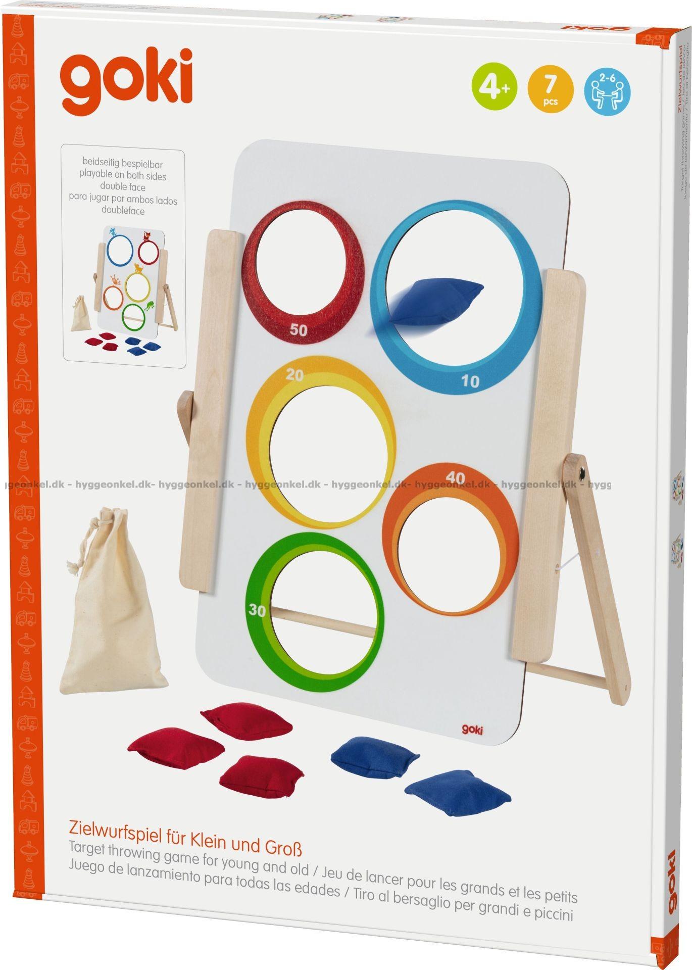 På siden med talfelter handler det om at ramme hullerne og samle point, hvor hvert kast tæller, og holdene skiftes til at kaste deres tre poser. Afstanden til målskiven kan justeres efter alder og niveau, hvilket gør spillet fleksibelt og tilpasset forskellige spillere. Den anden side er dekoreret med motiver, som åbner op for en mere legende tilgang, hvor reglerne kan varieres og tilpasses, så de mindste også kan være med.