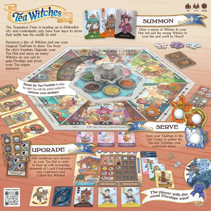 I Tea Witches indtager I rollen som te-hekse under den magiske Teaquinox-messe. Over fire dage konkurrerer I om at opnå mest mulig prestige ved at tiltrække loyale hekse, brygge og servere te, gennemføre takeaway-bestillinger og udbygge jeres egen tebod i byens centrum. Hver dag er opdelt i tre faser, hvor I først tilkalder hekse fra jeres personlige kortbunke, derefter bevæger jer rundt i byen med jeres te-hjælpere for at samle ingredienser og udføre handlinger, og til sidst klargør boden til næste dag.