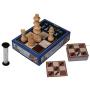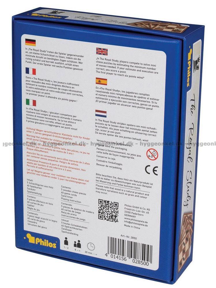 The Royal Study er et anderledes og tankevækkende brætspil, der kombinerer klassiske skakprincipper med små, udfordrende opgaver. Spillet går ud på at løse opgavekort ved at flytte fem kendte skakbrikker – konge, dronning, tårn, løber og springer – så de ender i præcis den opstilling, som kortet viser. Målet er altid at finde løsningen med så få træk som muligt, hvilket kræver både overblik, logik og evnen til at tænke flere træk frem. Når spillet spilles med to spillere, får det et konkurrencepræget twist. Begge spillere vurderer, hvor mange træk der skal til for at løse opgaven, og den første der melder et bud, sætter tidspres på modstanderen ved at vende sanduret. Modstanderen kan vælge at udfordre ved at forsøge at løse opgaven i færre træk. Den spiller, der enten løser opgaven korrekt inden for sit bud eller slår modstanderens bud, scorer et point, og vinderen er den første, der når seks point. Det skaber en intens og underholdende duel, hvor både strategi og mod spiller en afgørende rolle. Spillet kan også nydes alene, hvor det i stedet fungerer som et rent hovedbrud. Her er der ingen modstander eller point, men fokus er på fordybelse og problemløsning. Du arbejder i dit eget tempo med at analysere opgaverne og finde den mest effektive løsning, og du kan gentage udfordringerne for at forbedre dine resultater og minimere antallet af træk. Denne spilform gør The Royal Study ideelt for dig, der elsker logiske udfordringer og ønsker en rolig, men stadig stimulerende spiloplevelse. Med flere sværhedsgrader, der blandt andet introducerer muligheden for at dreje eller spejle opgaverne, udvikler spillet sig løbende og giver nye måder at tænke på. The Royal Study er derfor både et strategisk duelspil og et fordybende solo-hovedbrud, der udfordrer hjernen igen og igen.