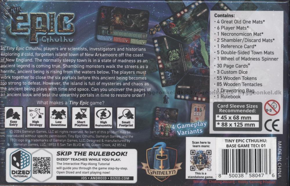Tiny Epic Cthulhu er et intenst og samarbejdsbaseret spil, hvor I trækkes ind i den dystre by New Arkhamoore, hvor en ældgammel ondskab er ved at vågne. Sammen skal I besejre The Great Old One og forhindre, at verden opsluges af vanvid. Spillet er opdelt i to faser, hvor I først skal samle og oversætte alle 25 sider i Necronomicon, mens I bekæmper Shamblers, håndterer voksende Madness Tentacles og forsøger at holde den ældgamle trussel fra at opbygge sin fulde styrke. Når bogen er fuldt oversat, begynder den afgørende kamp om at forsegle seks portaler, før det er for sent.