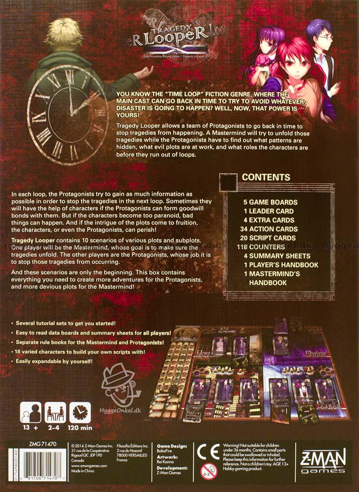 Tragedy Looper indeholder 10 forskellige scenarier med forskellige plots. En spiller vil være "mastermind", der sørger for, at tragedierne rent faktisk sker, mens de øvrige spiller protagonister og omvendt har til arbejde at sørge for, at tragedierne ikke sker.