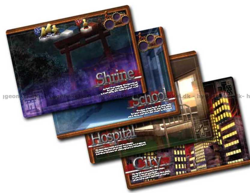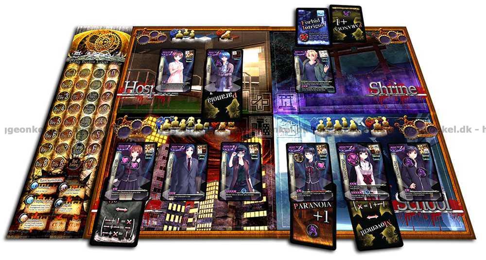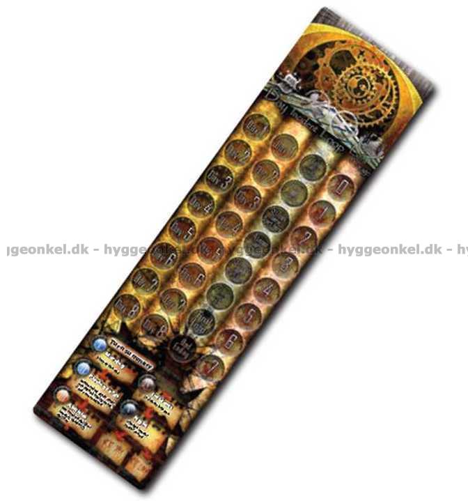 Æsken indeholder 5 spilleplader, kort, markører, opsummeringsark, spillerhåndbog og mastermind-håndbog.