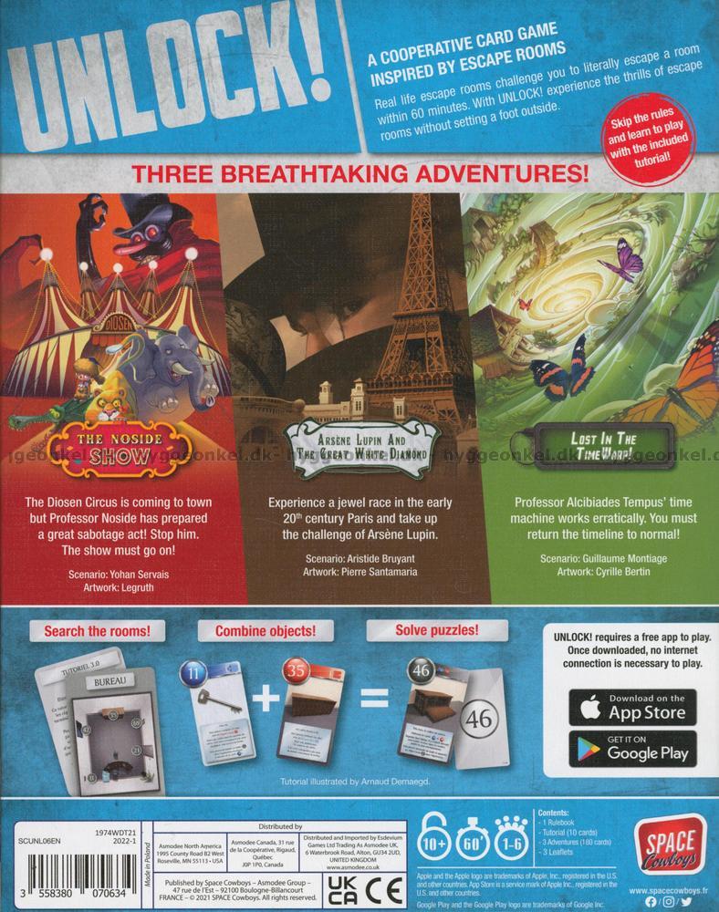 Unlock! er et kooperativt kortspil inspireret af Escape Rooms, der bruger et simpelt system, som lader jer gennemsøge lokationer, kombinere genstande og løse gåder. Spil Unlock! for at drage på fantastiske eventyr, mens I sidder ved et bord, og det eneste, I skal bruge, er kortene og en app, der kan give jer hints, tjekke koder og holde styr på jeres tid.