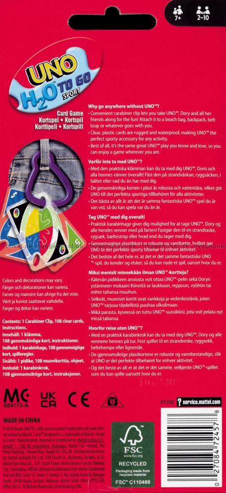 Uno: H2O To Go er den klassiske Uno-oplevelse i en frisk, vandtæt udgave – perfekt til stranden, poolen eller campingturen. Spillet kommer med gennemsigtige plastikkort, der tåler både vand og vind, så du kan tage den ikoniske farvekamp med dig overalt. Reglerne er de samme som i originalen: match kort efter farve eller tal, brug de drilske specialkort til at vende spillet på hovedet, og husk at råbe “UNO!”, når du kun har ét kort tilbage.