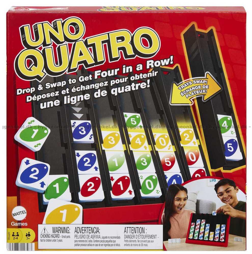 I Uno: Quatro handler det om være den første spiller, som får fire på stribe. Det kan enten være med tal eller farver. Retningen må være lodret, vandret eller diagonal. Få fx fire blå brikker på striber eller få fire 1-taller på stribe.