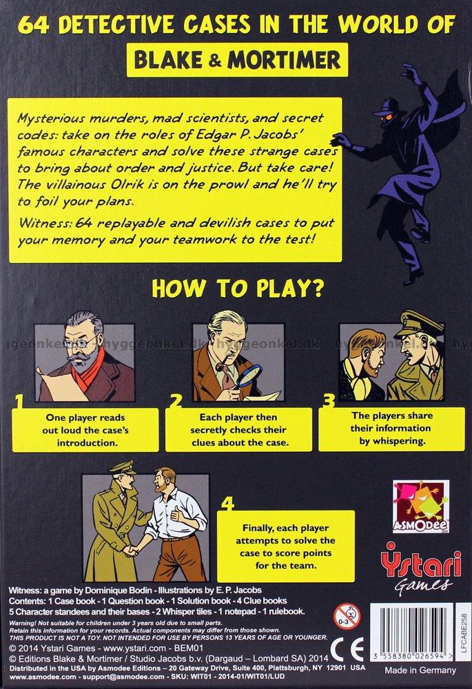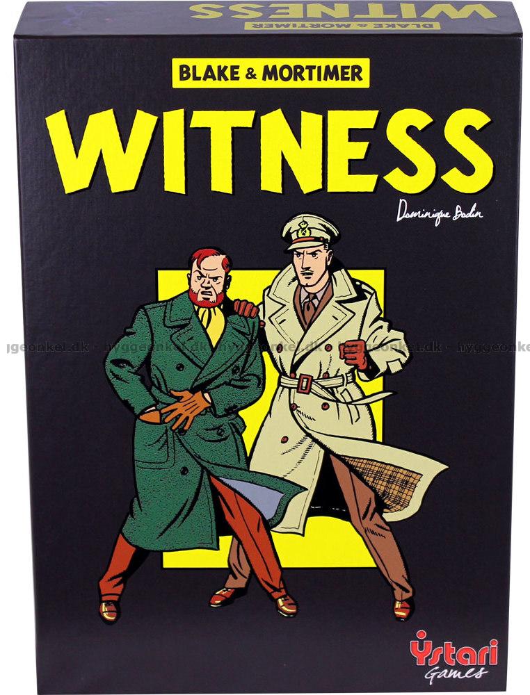 Witness stammer fra Blake & Mortimers tegneserie-verden. En serie, der startede tilbage i 1940'erne og er tegnet af Edgar P. Jacobs. I spillet (der kun kan spilles af 4 personer) påtager du dig en af de 4 roller. Målet er at løse mysterier ved at dele information med hinanden - men du er ret store begrænsninger på, hvordan I kan dele informationen..