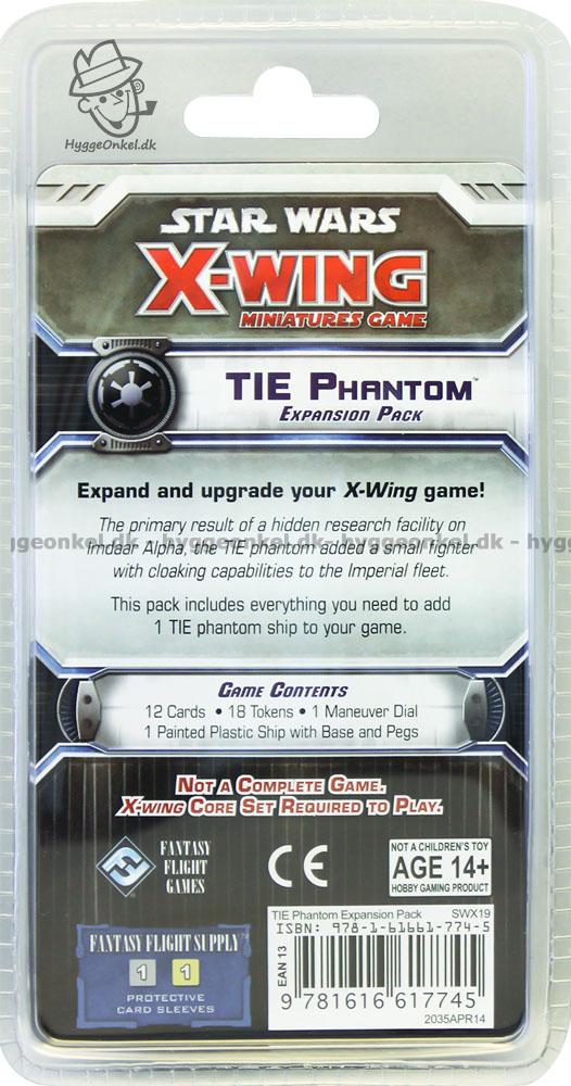 TIE Phantom-udvidelsen indeholder én TIE Phantom-figur, fire skibskort, fem opgraderinger, et manøvrehjul, referencekort over de nye regler, samt alle nødvendige brikker, så du bruge din TIE Phantom!