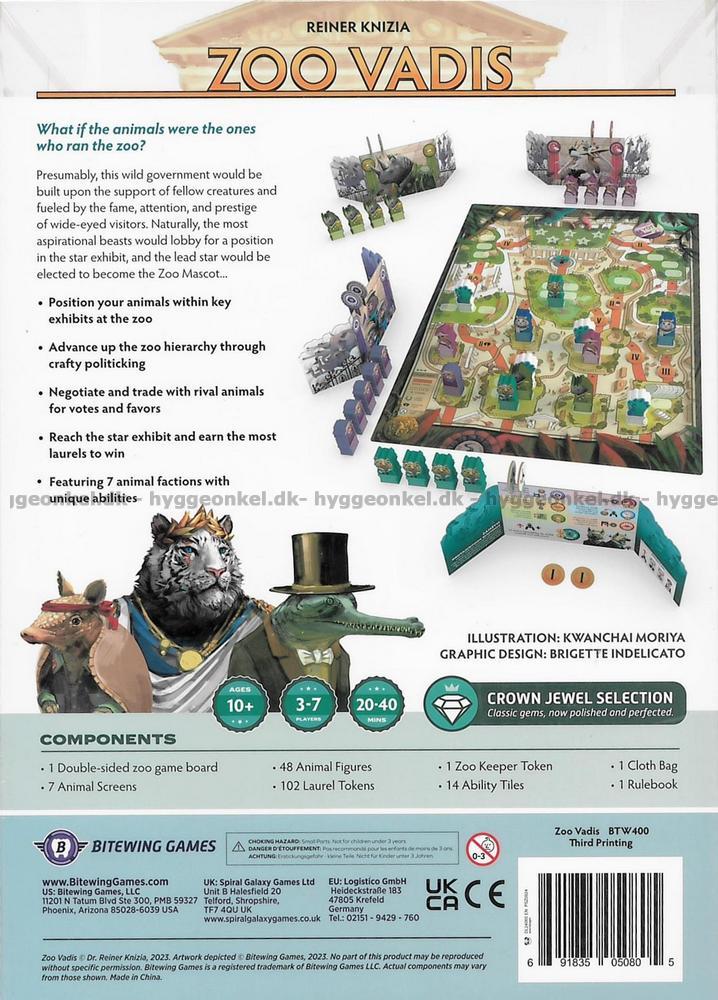 Det er ikke nok at samle flest point – hvis dine dyr ikke når frem til Stjerneudstillingen, har du slet ingen chance. Kun den mest strategiske, overbevisende og politisk snedige spiller vil kunne kalde sig den sande Zoo-maskot. Spørgsmålet er derfor ikke bare om du vinder – men hvordan du kommer derhen. Zoo Vadis spørger dig: Hvor er du på vej hen?